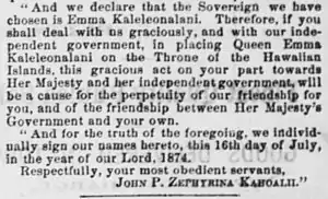 Kepelino was a staunch supporter of Emma's right to succeed King Lunalilo in the Royal Election of 1874 against Kalākaua.[14] During the days leading up to the election, he wrote to the King of Italy and Queen Victoria asking for warships to support Queen Emma's claim. These letters were intercepted by Kalākaua in his capacity as postmaster general.[5] Upon the announcement of Kalākaua's victory over Emma on February 12, 1874, her supporters instigated the Honolulu Courthouse riot which saw the destruction of government property and assault of multiple legislators who had voted against the queen. In order to quell the civil disruption, American and British troops were landed with the permission of the Hawaiian government, and the rioters were arrested.[15] Kepelino later claimed he played a role in quelling the unrest and attempted to have the queen come down from Hānaiakamalama to stop her supporters.[16] After the riot, Kepelino continued his political support for his employer and the Emmaites or the Queen Emma Party which formed to oppose the new king. In the summer of 1874, he started a petition to the French commissioner, Theo Ballieu, requesting French intervention to dethrone Kalākaua.[17][18] The petition, which was dated July 14 and signed under the name "John P. Zephyrina Kahoalii", argued "D. Kalakaua is not the rightful King, Therefore we grieve for the broken peace, and the loss of our independence. Because, this false king is doing that which will destroy our independence and cause great disturbance in the future. For this false king (D. Kalakaua) is very desirous of mortgaging the government to some foreign government for a million dollars."[19][20]