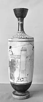 The Kerameikos steles are a collection of sculptures used as grave-markers (steles, sing. stele) in the Kerameikos necropolis of Attica. Kerameikos is located outside the Themistoclean Wall's Dipylon Gate. Stelai come in various shapes/designs and depict images varying from pottery to narrative scenes. They were often marble or limestone, and were carved or sculpted to depict the person being memorialized sometimes with relatives or slaves. Reliefs decorating the graves were meant to show the dead in their best light, using imagery to recognize their bravery in battle, or pathos, or wealth. These monuments marked the graves of Athenian men, fallen warriors, as well as non-citizens.[1] Women were also included in Kerameikos but typically it was the wealthiest or prominent women who were given stele.[2] In many vase paintings of grave scenes wreaths are seen resting at the base of stele. This was likely a popular way to adorn the graves of Greek loved ones.
