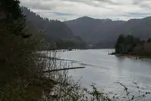 The "old" Kernville was the first European community in the area.[2] It was started in 1896 by Daniel and John H. Kern, who operated a salmon cannery, Kern Brothers Packing Company, on the north bank of the Siletz River. At the time, the isolated location was only accessible by boat. In 1907 the cannery was sold and the new owners dismantled the building and rebuilt it on the south bank of the river. The sawmill, post office and original community of Kernville were also located on the more accessible south bank. Eventually the old town site, including what remained on the north side of the river, was abandoned. As of 1945, "new" Kernville was located about a mile downstream from its original location, near the old Oregon Coast Highway bridge. Since the rerouting of U.S. Route 101 and the completion of a new Siletz River Bridge in the 1980s, new Kernville is no longer on the main highway. Kernville post office ran intermittently from 1896-1968.[1][3]