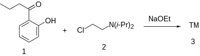 Williamson ether synthesis between 2'-hydroxybutyrophenone [2887-61-8] (1) and diisopropylaminoethyl chloride hydrochloride [4261-68-1] (2) gives Ketocaine (3)..