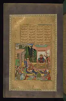 The manuscript in London has 325 folios of "light-brown polished paper" with a page size of 302 x 198 mm. On text pages the nastaliq script is in four columns of 21 lines.[16] There is also some text on most of the miniature pages, inside the rectangular frame in compartments of varying size, shape and placing. The miniatures have somewhat variable rectangular frames of plain lines and bands of colour, outside which there are generous borders filled with very high quality gold grisaille decoration of plants, birds and animals, with some rocks and other landscape elements. Outside this are further plain frames, with a final zone of simple pen decoration which is probably recent as the form is different between the pages in London and those in Baltimore.[17]