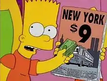 Some conspiracy theorists believe that a scene in the episode foreshadows the September 11 attacks: in it, Lisa holds a brochure for a $9 bus fare with the World Trade Center shown in the background.[10] Showrunner Al Jean said in an interview with The New York Times in 2018, "There is a frame where there's a brochure that says New York at $9 a day, and behind the nine are the twin towers. So they look like an 11, and it looks like a 9/11. That one is a completely bizarre, strange thing."[11] Bill Oakley, the episode's showrunner, reacted to a New York Observer article in 2010 via Twitter by saying, "$9 was picked as a comically cheap fare...To make an ad for it, the artist logically chose to include a silhouette of NYC. I signed off on the design. It's pretty self-explanatory. And I will grant that it's eerie given that it's on the only episode of any series ever that had an entire act of World Trade Center jokes."[10]
