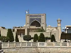 Khoja Abdulkhalik Gijduvani Complex is an architectural monument (XII-XV centuries[1]) located in the city of Gijduvan, Bukhara Region. The complex is located 50 km from the city of Bukhara and was built by Abdukholiq ibn Abdujalil Gijduvani, the founder of the Khojagan sect.[2] The complex consists of the mausoleum of Khoja Abdulkhaliq Gijduvani, the Ulugbek Madrasah, a mosque and a pool. Khoja Abdulkhaliq Gijduvani is the first representative of seven pirs in Bukhara. He became known as Khojai Jahan and founded the school of Sufism. In 1433, Timurid Mirza Ulugbek built a madrasa in front of the shrine of Khoja Abdulkhaliq Gijduvani. In 2003, the 900th anniversary of Khoja Abdulkhaliq Gijduvani was widely celebrated.[2] The Ulugbek madrasah in the complex was distinguished by its appearance. A mosque was built in this complex during the reign of Shaibani Ubaydullah Khan of Bukhara (15391550). In 1583, the madrasa and mosque were renovated during the reign of Bukhara Khan Abdullah Khan II (15831598). Verses 1-7 of Surah Alaq were mentioned on the facade of the Mirzo Ulugbek madrasah.[3] These notes were written in suls script. However, most of them have collapsed. In 1946, certain part of the Mirzo Ulugbek madrasa records were read and accordingly it was restored.[4] The tombstone of Abdukholiq Gijduvani was made of stone and the eleventh verse of Surah "Mujodala" from the Quran was written on the sides. On the short sides of the tombstone, an epitaph (inscription devoted to that person) was written.[5] The mosque in the complex of Khoja Abdulkhaliq Gijduvani was rebuilt in 2003.[6] Nowadays, all the conditions for pilgrims have been created in the complex of Khoja Abdulkhaliq Gijduvani.