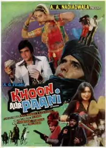 Khoon Aur Paani (transl. Blood and water) is a 1981 Hindi-language action film, produced by A. A. Nadiadwala under the A.G.Films Pvt. Ltd. banner and directed by Chand. It stars Feroz Khan, Jeetendra, Rekha, Parveen Babi and music composed by Laxmikant–Pyarelal.