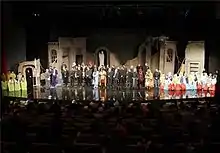 Khorshid Karevan (Persian: خورشید کاروان) is an Iranian play written by Mahdi Motevasseli from Fadak Cultural Institute[1] started in 1990, played on scene for 29 consecutive years in Iran. The play has also been on scene in countries other than Iran including UK, UAE and the Netherlands. The popular religious theater in 2015 attracted 23000 spectators attending the performance in Tehran in Milad tower.[2] It has been estimated that more than a million spectators in total have seen the performance over the past 26 years.[3] The theater goes on scene in Muharram and Safar in memory of Ashura and its aftermath every year in Tehran and other cities in Iran.