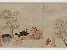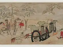 The Kibi Daijin Nittō Emaki originally consisted of a single scroll 32 cm (13 in) high by 2,440.8 cm (960.9 in) long, the longest single scroll ever known, before being separated into four parts.[2][3] It dates from the second half of the 12th century (end of the Heian period (794–1185) or early Kamakura period (1185–1333)), when a renewed interest in the narrative subjects and life of the people was reflected in the topics of contemporary emakimono.[4][5]
