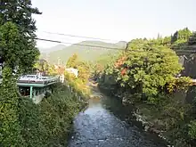 Kibishima river (Japanese:亀尾島川) is a first-class river in the Kiso river system located in central Japan. It flows through Gujo City in Gifu Prefecture. The river originates in the Koshimi Mountains (altitude 1,148m) on the border between Gifu and Fukui Prefecture, flows southeast into Hachiman-cho, Gujo City, joins the Nabi River from the right bank, and then changes its flow to the east-southeast. The catchment area is 120.4 km2 and has a river length of 24.1 km up to the Nagara River. [1]