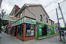 The long-established Mimi Variety store at 252 Queen Street East is used for exterior shots and as the model for the interior set built in the studio. While the signage has been adjusted, the "Kim's Convenience" sign uses the same red and green lettering as the original sign. All other sections, such as the "7 DAYS A WEEK" element, are the original signage of Mimi Variety.[16] The owners of the Mimi Variety store have retained the new signage, even though the business has not officially changed its name.[16][17] The producers also painted a mural on an exterior wall, mostly seen in the credit sequence and for stock transitional shots, as well as for promotional shots.