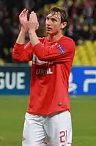He played in all of Spartak's 2012–13 UEFA Champions League group matches, receiving a red card in a 2–1 defeat at Celtic on 5 December 2012.[59]