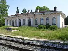 The railway connecting Saint Petersburg with Tallinn crosses the district from east to west. Both Kingisepp and Ivangorod are on this railway. Veymarn is an important node station. There, one railway branches off south and runs to Slantsy and Gdov. It was running all the way up to Pskov before World War II, but the stretch between Gdov and Pskov was destroyed during the war and never restored. Another railway runs north from Veymarn to Sosnovy Bor (Kalishche railway station) and to Saint Petersburg. Kotly is a node station and the starting point for the railway running to Ust-Luga. There is no passenger service between Veymarn and Ust-Luga or Kalishche. There is a passenger train between Saint Petersburg and Tallinn, which stops both in Kingisepp and Ivangorod.