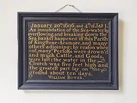 The village suffered serious flooding in the Bristol Channel floods of 1607 when the sea walls were breached and the church in Kingston Seymour was said to have 5 feet (2 m) of water in it for ten days.[4] The parish, which extends to the Severn Estuary coast, saw flooding on a regular basis as late as the 1800s. After flooding, the land was considered unsuitable for dairy cattle for some time and the resulting bad air was said to cause "attacks of the ague" in local people.[5]