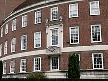 It is a neo-Georgian red brick building with Portland stone dressings and tiled roof, laid out to a semi-circular plan.[1] To the centre of the semi-circular elevation is a massive square tower with a low octagonal spire and fluted corner pinnacles.[1] The central entrance is in the base of the tower. Above it is a two-storey, round headed window set in an open pedimented stone niche with simplified Corinthian columns rising from a corbelled balcony.[1] Pictorial references to the River Thames are displayed upon a keystone inside the niche, and on the corbels, capitals and iron gates. The coat of arms of Kingston is set further up the tower.[1] Inside, there is a marble lined circular entrance hall, and a central staircase with original opaque glass semi-spherical lamps.[1]