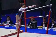 In artistic gymnastics, a kip is a technique that involves flexing or piking at the hips, and then rapidly extending the hip joints to impart momentum.[1][2] It may be performed in some form on all apparatuses, but is most commonly performed on the women's uneven bars[3] and on the men's rings, parallel bars, and horizontal bar.[4]