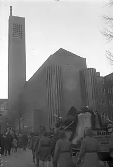 Kirche am Hohenzollernplatz (Church at Hohenzollernplatz ) is the church of the Evangelical Congregation at Hohenzollernplatz, a member of today's Protestant umbrella Evangelical Church of Berlin-Brandenburg-Silesian Upper Lusatia. The church is located on the eastern side of Hohenzollernplatz in the locality of Wilmersdorf, in the Berlin borough of Charlottenburg-Wilmersdorf. The building is considered a leading example of Brick Expressionism[1] and a testimonial to the unique quality of expressionist church architecture in Berlin.[2] The naming of the church after the city square it faces was originally considered a temporary solution until a more suitable one was chosen. The name stuck however, though the debate continues.[2]