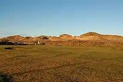 The short single platformed halt stood on the west of the line just south of Kirkton Bridge with the Fraserburgh golf club house nearby, located between the St Combs branch and the Fraserburgh branch close to the point where the two lines diverged. It was accessed via a path running across the road from the clubhouse and photographs show that it was built of wood with a gravel surface. No shelter or lighting were provided and the station had no sidings or signalling. A level crossing was located nearby at the 1.6 km or 1 mile mile post on the running towards St Combs.[7] White posts beside the track at the halt assisted the train driver in positioning the train in poor light conditions or after dark.[5] The gradient running towards St Combs was 1 in 50.[5]