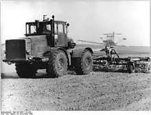 The tractor was manufactured in 1962, its basic design has been adopted in several subsequent models. The K-700s were also exported to the Comecon member—GDR imported K-700s starting from year 1968.[1] The K-700 is a heavy four-wheel drive tractor-pulling force of 50 kN-class articulated and disconnectable rear wheel drive. The connecting piece of the front and rear frame part is movable about the vertical and the longitudinal axis, the steering takes place by lateral bending by means of hydraulic. It is powered by an eight-cylinder turbo diesel engine in a V-configuration with 215 HP. The K-700 1975 was the further development of K-700 A, including the disposal of the next larger fuel tanks (two tanks of 320 liter capacity) due to larger tires for better traction. The K-700 A provided only a temporary solution.[1] Also in 1975 a successor of K-700 appeared: the K-701. The K-701 has a 12-cylinder naturally aspirated diesel engine with 300 HP. The K-700 tractors were particularly large sized, handling well although the noise and vibration load on the driver was relatively high.[1] In the GDR, its size in off-field operations was sometimes cumbersome.[1] Furthermore, the tractor's sheer size often resulted in soil degradation.