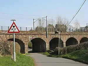 The station had a number of sidings, a goods shed, turntable, signal box, a bay platform and an interchange with the main line.[2] A narrow gauge mineral line ran over the main line to serve local quarries and the old bridge survives as part of a narrow access lane.