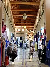 The Kissaria (a term also used in other parts of the Islamic world and also transliterated from Arabic as qaysariyya) is interconnected with the Souq al-'Attarin and consists of a close network of lanes and alleys which are filled with hundreds of shops.[4][6][7][1] It is only one part of a larger commercial district and of a network of souqs (markets) across the city, but was traditionally the most prestigious and most central commercial complex, where the most luxurious goods were sold.[8] This arrangement of a planned bazaar at heart of the city, near its most important religious and civic monuments, was typical of many major cities in the Islamic world.[9]