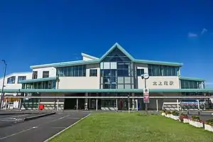 The station has two side platforms, connected by a footbridge, with an elevated station building. The station is staffed.