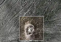 The crater shows a bright white central peak and rim, and dark brownish material surrounding it. Diffuse dark rays, sprinkled thinly atop surrounding grooved terrain, emanate from the impact site. The dark material dusted over the surface is probably part of a dark impactor (asteroid or comet) which was strewn across the surface upon impact. The impactor hit grooved terrain, and a straight segment of the crater's rim was created when a portion of the rim collapsed along the trend of an older fault.