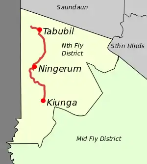 Kiunga is a port town on the Fly River[1] in the Western Province of Papua New Guinea,[2] just upstream from the D'Albertis Junction with the Ok Tedi River.[3] It is the southernmost terminus of the Kiunga-Tabubil Highway. Local industry rests on a cornerstone of freight and haulage, particularly from the Ok Tedi Mine and provisioning for the much larger town of Tabubil. Natural rubber has been an emerging industry more recently, with a processing/manufacturing plant being built in town.[4]