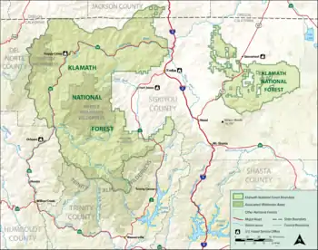 Klamath National Forest is a 1,737,774-acre (2,715 sq mi; 7,033 km2) national forest, in the Klamath Mountains and Cascade Range, located in Siskiyou County in northern California, but with a tiny extension (1.5 percent of the forest) into southern Jackson County in Oregon.[1] The forest contains continuous stands of ponderosa pine, Jeffrey pine, Douglas fir, red fir, white fir, lodgepole pine, Baker Cypress (Cupressus bakeri), and incense cedar. Old growth forest is estimated to cover some 168,000 acres (680 km2) of the forest land.[2] Forest headquarters are located in Yreka, California. There are local ranger district offices located in Fort Jones, Happy Camp, and Macdoel, all in California. The Klamath was established on May 6, 1905.[3] This forest includes the Kangaroo Lake and the Sawyers Bar Catholic Church is located within the boundaries of the Forest. The Forest is managed jointly with the Butte Valley National Grassland.