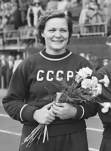 Klavdiya Aleksandrovna Tochonova (Russian: Клавдия Александровна Точёнова; 16 November 1921 30 May 2004) was a Soviet track and field athlete who competed mainly in the shot put. She won a bronze medal at the 1952 Summer Olympics and silver at the 1950 European Championships. In October 1949 she set a world record of 14.86 m in Tbilisi. Tochonova won the shot put event at the 1949 and 1951 World Student Games and at the 1951 Soviet championships. After retiring from competitions she worked as an athletics coach in Saint Petersburg.[1]