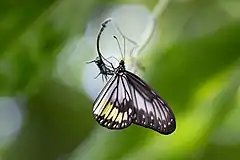 Kleptopharmacophagy has only been reported for butterflies in the subfamily Danainae, more commonly known as the milkweed butterflies. The phenomenon was first described in butterflies that were observed scratching and feeding on live larvae of other milkweed butterflies.[3] The initial discovery was made in year 2019 in forests of North Sulawesi, in Indonesia, when two researchers noticed that milkweed butterflies of different species,[2][6] well-known for their toxicity and bright warning colours (aposematism),[3] were interacting with the larval stages of other butterflies.[2][6] The adult insects were attacking and harassing the caterpillars by scratching at them with tarsal claws on their legs.[2] The butterflies then imbibed the juices from the wounded caterpillars with their long and curved proboscis.[6] Caterpillars that were targeted appeared to range from living to dead and dying individuals. Live caterpillars were observed to contort their bodies in an attempt to deter scratching, but usually succumbed to the repeat harassment.[2][6]
