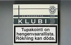 ![]() An old Finnish pack of Klubi cigarettes, with a Finnish and Swedish text warning at the bottom of the pack. | |