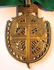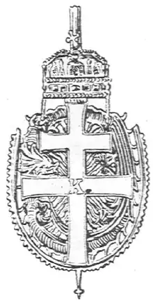 According to the Hungarian jurist Ignác Kassics, in 1691 king Leopold I knighted his favorite court servant, a certain Hannibal Dascoli, but this time the primarily personal title was given to his male descendants, as well, as a reward for the military merits made by him and his ancestors. At the same time, he was given the ornaments of the order: belts, necklaces, rings, spurs, other ornaments of the order, and a special diploma of knightment.[41] In 1840, Kassics also describes the insignia of the order,[42] (probably referring back to the 1742 book of József Pintér:[43] a cross-shaped golden "decorative medal" hanging from the gold necklace. In the middle of the cross was placed the shield of Hungary, besides a lion is standing edgewise, and above is the Holy Crown of Hungary floating. According to Kassics, in his times, the knights were also privileged, not to put off their swords when taking an oath.[44]