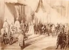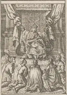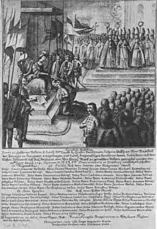 In the beginning, it was not stated in advance who will be knighted during the coronation. In 1563, at the coronation of king Maximilian I some nobles were knighted who fought successfully in Turkish wars, like György Thury, Antal Székely, László Gyulaffy and Miklós Hennyey.[36] However, there also appeared a lot of people who were unworthy of honoring this title, but simply jostled themselves forward during the coronation, so the knighting ceremony had to be abandoned. For this reason, in later times the palatine (the military leader of the country) was entitled to choose the candidates for knighting.[37] In 1598, Archduke Matthias made knights of golden spur Ferenc Nádasdy and Miklós Pálffy in Győr, newly recaptured from the Turks. New knights were made in 1608, during the coronation of Matthias II.[38]