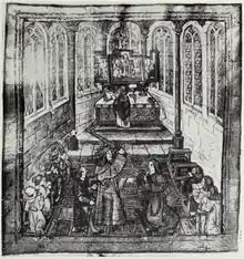 The baby king Ladislaus V was knighted in 1440 by Miklós Újlaki, voivode of Transylvania before his coronation.[30] The new knights were also created by him.[31] King Matthias made new knights not only during his coronation, but also on some festive occasions. On 24 June 1488 in Vienna (under Hungarian occupation that time) the Swiss Envoy Melchior Russ was knighted, in the presence of the courtiers and ten foreign ambassadors.[32] He awarded the Order of the Dragon to the higher ranked persons, and also gave them fashionable golden spurs. According to a report of the Swiss ambassador Schilling, there were only 12 such knights throughout Hungary.[33] These persons were not members of a knightly order but the personal knights of the king.