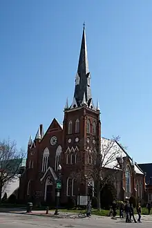 The current red-brick Gothic style building was dedicated May 20, 1888. It replaced the old frame church, called Oakville Presbyterian Church. The new church had taken a year to build and cost $16,000, a huge amount in those days. To build it, 60 members of the congregation signed a promissory note and the church purchased the White Oak Hotel at the corner of Dunn Street and Colborne Street, later to become Lakeshore Road. The hotel had once been a wild drinking place called O'Reilly's Tavern and a later owner took to keeping a live bear chained up to amuse customers;[4] Oakville residents voted the town dry in 1881 and by 1887 the owner was willing to sell it to the Presbyterians for $1,600. The old hotel was cut into three sections and moved off the site - one section is still downtown today at 152 Lakeshore Road. A church bell was installed several years later - the exact date is in dispute - cast in New York State. By 1894, a "pedal organ" had been approved, to the consternation of the more conservative members of the church who regarded it as "the devil's instrument."