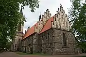The oldest settlement which is now Końskie dates back to the 11th century. The burial ground from this period was discovered in the north part of the town in 1925. Końskie was mentioned in historical sources in 1124 for the first time, with Prandota of Prandocin (the progenitor of Odrowąż family) recorded as the owner of the settlement. For the next few centuries the settlement was owned by the Odrowąż family. Iwo Odrowąż, the bishop of Kraków, founded a parish and built a church dedicated to St. Nicholas in 1220–1224. The church was torn down in the 15th century and a new Gothic one was built in its place in the years 1492–1520. Some elements of the older Romanesque church were saved in the new one (e.g. the Romanesque tympanum, pictured). Końskie received city rights from King Augustus III of Poland on December 30, 1748.[1] It was a private town, administratively located in the Żarnów County in the Sandomierz Voivodeship in the Lesser Poland Province.[2] The Polish 14th Cuirassier Regiment was formed in Końskie by Stanisław Małachowski in 1809.[3]