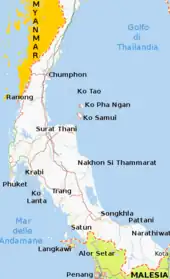 The island of Koh Tao is located in Southern Thailand. Measuring 21 square kilometres (8 sq mi) in area, it is the smallest of three popular tourist islands in the Gulf of Thailand.[1] Receiving half a million visitors each year,[1] Koh Tao is especially popular with backpackers and known for its marine life and scuba diving. It has over 100 hotels and resorts and was deemed the busiest diving centre in Southeast Asia in 2014.[2] In 2014, the island had a population of around 5,000 locals. Burmese migrant workers made up an additional 5,000, around 2,000 of these being illegal immigrants who bribe local police by paying 500 baht each month. These illegal workers often reside with friends on the island, making it difficult to identify them. Some of these workers said they can earn more money in Thailand compared to Myanmar.[3] The murders were the first cases of homicide on the island in over eight years.[4]