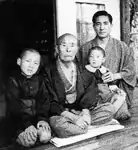 A portrait of the men of the Koizumi family in the 1940s or early 1950s. Junichirō is at left and Matajirō is in center; Jun'ya is holding his son Masaya at right.
