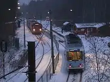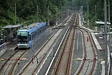 At Øraker the Lilleaker Line meets the Kolsås Line, after which point the lines share tracks.[3] The line crosses the municipal border across the river Lysakerelven. The now closed station of Lysakerelven, 8.4 kilometers (5.2 mi) from Stortinget, was situated on the Bærum side of the municipal border between Oslo and Bærum.[4] At Jar there are two sets of platforms, one for the metro and one for the trams. The continues past Ringstabekk, which is only served by the metro. It replaced three disused stations, Tjernsrud, Ringstabek and Egne hjem.[3] Situated 11.4 kilometers (7.1 mi) from Stortinget,[4] Bekkestua is the terminal station for the tramway, and a major transit hub for central Bærum. Like Jar, it features two sets of different platforms. The shared rail section features both third-rail power supply and overhead wires. The trams have a narrower loading gauge and shorter platforms, making it necessary to provide separate platforms for them.[3]