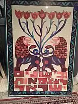 The first felt wall hanging that Kopel produced was intended for the American Cultural Centre in Jerusalem and its theme was the United States Declaration of Independence. The wall hanging, which measured 2.85 X 1.85 meters, was stuck on a wooden panel. Kopel ordered rolls of felt from France and began work on wall hangings based on bible stories. He used a needle, hand sewing small even stitches with black embroidery thread which framed and highlighted every detail in the work, as well as using appliqué. Each wall hanging was constructed of three elements: the main motif/ story, the decoration (ornamentation) and the Hebrew text which usually framed the work. The lettering was designed in a square font contrary to the accepted biblical calligraphy.[36][37][38]