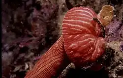 The spinnaker anemone is a medium-sized anemone of up to 10 cm in diameter. It is a vividly coloured red and white striped anemone. Its column has fine striping. It has about 50 broadly striped tentacles. Red and pink lines radiate outwards from its mouth. It has a walking disc which is red with white striping.[2]