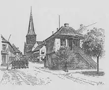 The stepped gables in front of the steeple of Vor Frue Kirke are parts of Korsbrødregården. (19th century)