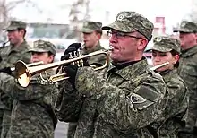 A trumpet player with the band during an army day celebration at Adem Jashari Barracks.