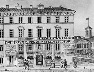 The first building at the modern location of Nevsky, 18 was constructed at the beginning of the 18th century. It was a small wooden house owned by Cornelius Cruys - the Vice Admiral of the Imperial Russian Navy and the first commander of the Russian Baltic Fleet, close associate of Peter the Great.[1][2] In 1738 the property passed to tailor Johann Neumann. He hired a famous architect Mikhail Zemtsov to build a new two story stone house. Neumann's house facade faced Moika, and the side to Nevsky Prospekt didn't even have windows. This shows that at the time, Nevsky didn't yet obtain its status of the main street in the Saint Petersburg. The house hosted the museum of wax figures - first in city, although it only existed for one year. Several boutiques operated in Neumann house. In 1743, German merchant Johann Albrecht was selling tableware made from serpentine stone, which supposedly rejected poison (considering the times, it was an attractive proposition). Frenchman Charpentier was selling powder, and Dutch merchant le-Roi had a shop "Rotterdam" selling chocolate, vanilla and ink.[1]