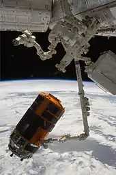 After an extended two-month stay, on 28 March 2011, Kounotori 2 was detached from the docking port by robotic hand at 15:29 UTC and released at 15:46 UTC.[20] It reentered the Earth's atmosphere at around 03:09 UTC on 30 March.[21] The reentry was logged by a Reentry Breakup Recorder, one of two carried to the station; the other was installed in the Johannes Kepler ATV and was intended to record its return, but failed to make contact following reentry; consequently, no data was retrieved.[22][23]