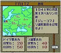 Players have access to in-mission help and the option menu.[4] Attack, defense, and speed statistics are covered for each unit.[4] Like in real history, the game ends after the player is scripted to lose the Battle of Moscow, which saw nearly 1.6 million casualties on both sides of the battle. The player is given a brief message by a man in a motorcycle, then a game over screen appears. The timespan of the Super Famicom version of the game is from June 1941 to September 1943; approximately the duration of Nazi Germany's forward offensive moment in the Eastern Front of World War II.[3] However, the NEC PC-9801 version of the game extends the timespan to March 1945, when the player has to defend the Third Reich from the invading Anglo-American forces.
