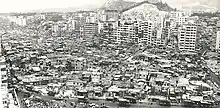 In January 1950, a fire broke out that destroyed over 2,500 huts, home to nearly 3,500 families and 17,000 total people.[12] The disaster highlighted the need for proper fire prevention in the largely wooden-built squatter areas, complicated by the lack of political ties with the colonial and Chinese governments.[13] The ruins gave new arrivals to the walled city the opportunity to build anew, causing speculation that the fire may have been intentionally set.[13][14]