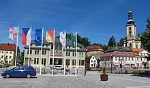 The town hall is a Neo-Renaissance building with Art Nouveau elements built in 1899–1900, originally as the seat of the savings bank.[5]