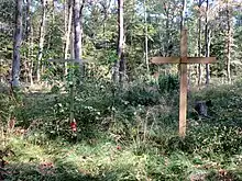 Sajevce is the location of one of two known mass graves in the Krakovo Forest associated with the Second World War. The sites consist of 10 large mounds and contain the remains of an undetermined number of Croatian prisoners of war, civilians, and possibly German soldiers as well. The Krakovo Forest 1 Mass Grave (Slovene: Grobišče Krakovski gozd 1) is located in the woods about 250 meters (820 ft) northeast of the Ponikvar farm.[7] The grave site was created simultaneously with the Krakovo Forest 2 Mass Grave (Slovene: Grobišče Krakovski gozd 2) in neighboring Kostanjevica na Krki.[8] The two sites were created around May 15, 1945, when Partisan forces captured about 4,000 Croatian soldiers and civilians at Dobruška Vas fleeing toward Austria. They were held on the left bank of the Krka River and killed in the forest over the course of a few days; eyewitnesses stated that the victims included children, women, and elderly persons.[9]
