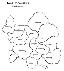 Standesamt is the German name of the local/municipal civil registration offices which were established in October 1874 soon after the German Empire was formed. Births, marriages and deaths were recorded. Previously, only duplicate copies of church records were used. By 1905, Kreis Hohensalza had the following 15 offices for rural residents:[1]