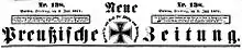 Its original name was officially the Neue Preußische Zeitung (New Prussian Newspaper), although because of the Iron Cross as its emblem in the title, it was simply called the ‘Kreuzzeitung’ (Cross Newspaper) in both general and official usage. In 1911 it was renamed the Neue Preußische (Kreuz)-Zeitung and then after 1929 the Neue Preußische Kreuz-Zeitung. Between 1932 and 1939 the official title was simply the Kreuzzeitung.[1][2][3] From its first issue to its last, the newspaper used the German motto from the Wars of Liberation "Forward with God for King and Fatherland" as its subtitle.[4][5] It had editorial offices in various cities in Germany and abroad. Its headquarters was in Berlin.