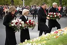 Throughout Kariņš' term as prime minister, relations between Latvia and Russia significantly worsened, particularly following the 2022 Russian invasion of Ukraine. At the Riga StratCom Dialogue in May 2022, Kariņš said that, "in order to ensure peace and security in Europe and the world, Russia must lose this war. Ukraine must win. This is the only way we can return to a peaceful life".[69] At the same meeting, he also criticized certain western European leaders' perceived willingness to negotiate with Russia over the conflict.[70] In a summit of Baltic sea countries in Copenhagen, Kariņš said that "countries surrounding the Baltic Sea should minimise economic cooperation with Russia, especially in the energy sector".[71] On 25 August 2022, a Soviet war memorial that had been protected under a treaty between Latvia and Russia was torn down. Kariņš said that along with decreasing energy dependence on Russia, this action "freed Latvia from the lasting consequences of occupation."[72] On 8 September 2022, the Kariņš government approved additional restrictions on the entry of Russian citizens into Latvia via the external border of the European Union, with Kariņš saying that Russian citizens freely moving around the EU while Russia invaded Ukraine was " unacceptable both from a moral and security considerations".[73]
